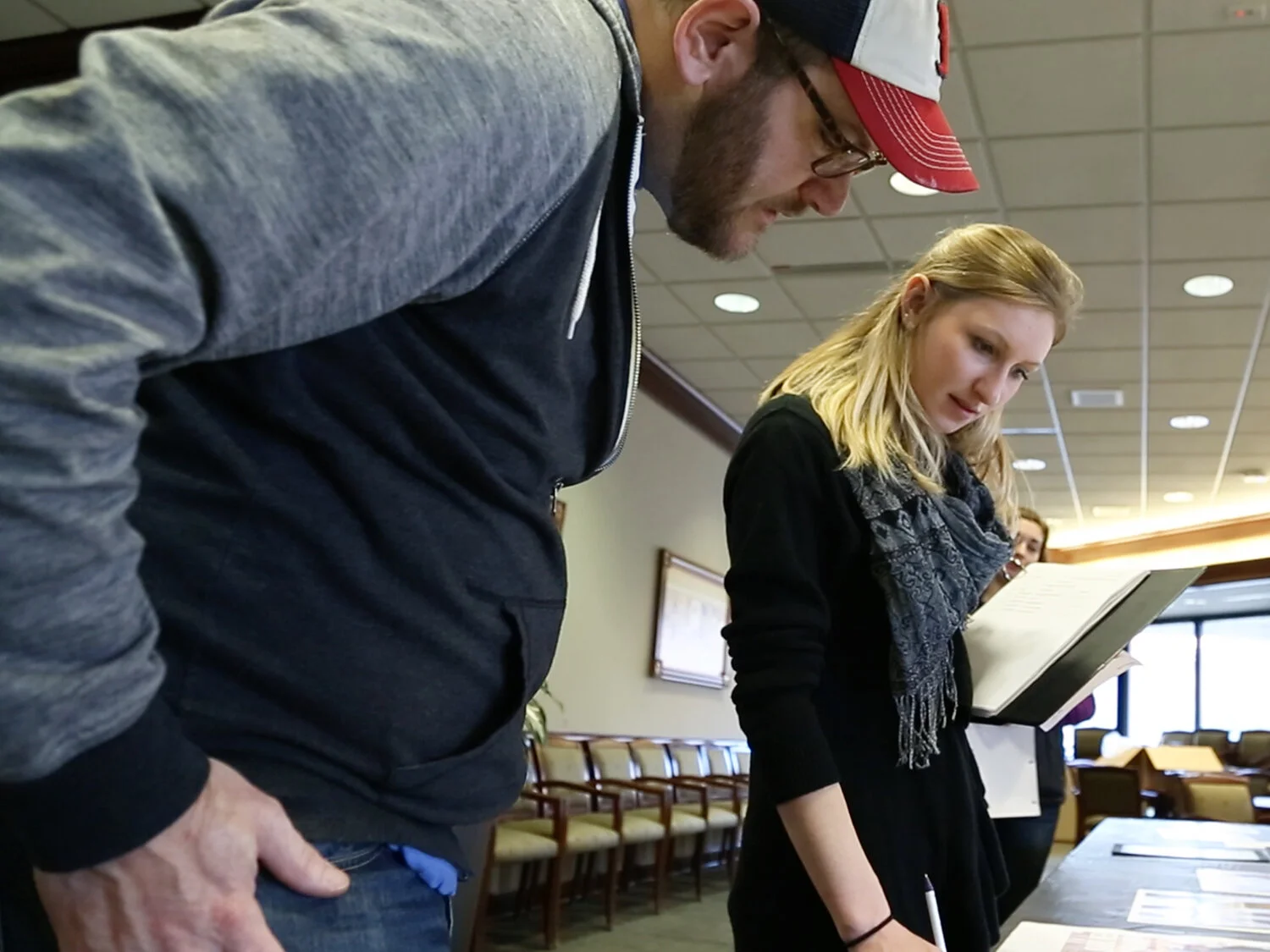 Lindenwood student Sierra Teson, right, shadows Blaine Loyd as he judges the St. Louis ADDYs.